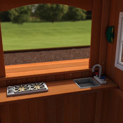 - Lower Playhouse: Includes a play kitchen with a toy stovetop, sink, cordless phone, and a full front door to create a cozy charming mountain home