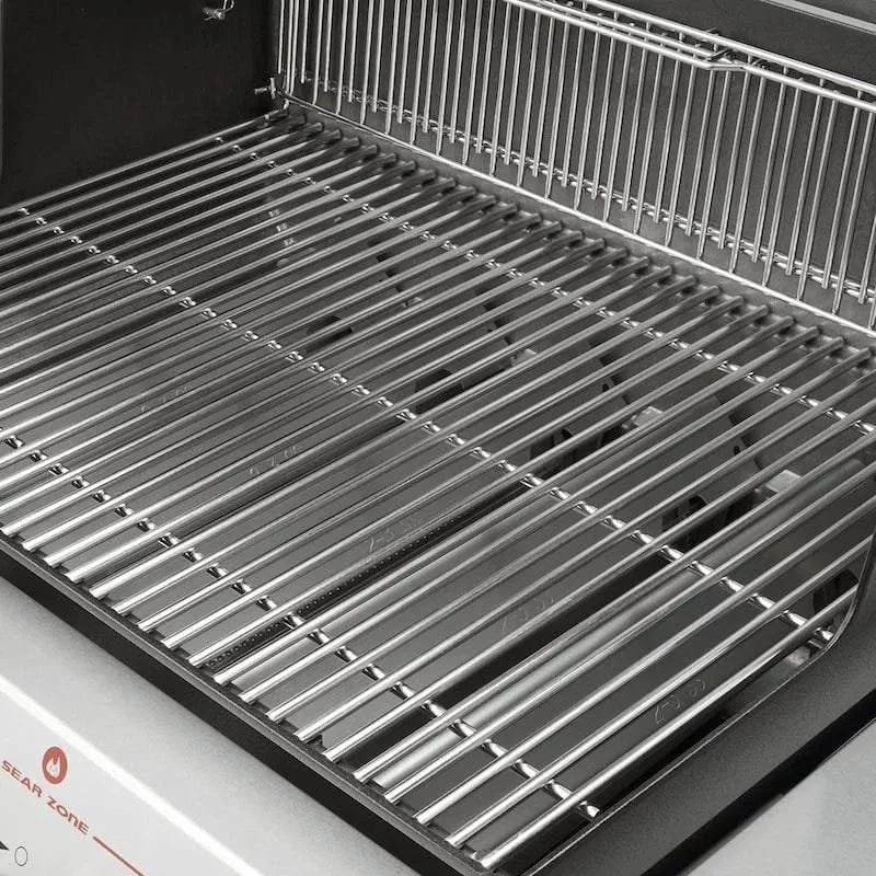 Introducing the newly designed GENESIS grill that allows you to prep, sear, and serve everything outside, where the party is. The newly designed GENESIS gas grill features our largest and hottest sear zone, with expandable top cooking grate so that the main course and sides are all grilled and served at the same time. Once food is ready, easily transfer it to the large prep & serve table, making for a seamless prep-to-serve grilling experience. • Sear multiple steaks at once on the extra-large sear zone • Expandable top cooking grate creates a second level of grilling • Compatible with WEBER CRAFTED (frame & grillware sold separate) • Extra-large prep & serve table • New and improved pull-out grease tray Part Number: # 35300001 Grill Specifications Main burners: BTU-per-hour input 39,000 Sear Zone burner: BTU-per-hour input 13,000 Dimensions – Lid Open (inches) 63” H x 62“ W x 31“ D Dimensions – Lid Closed (inches) 48.5“ H x 62“ W x 27“ D Top grate (square inches) 274 Primary cooking area (square inches) 513 Total cooking area (square inches) 787 Weight (pounds) 179 Stainless steel burners 3 Fuel type Liquid Propane (20 lb. tank sold separately) Side tables 2 Swivel casters 2 Swivel locking casters 2 Tool hooks 6 Battery type AA Batteries 1 Warranty Information Close Cookbox 12 years, no rust through/burn through (2 years paint excluding fading or discoloration) Lid assembly 12 years, no rust through/burn through (2 years paint excluding fading or discoloration) Stainless steel burner tubes 10 years, no rust through/burn through Stainless steel cooking grates 10 years, no rust through/burn through Stainless steel FLAVORIZER BARS 10 years, no rust through/burn through Porcelain-enameled cast iron cooking grates 10 years, no rust through/burn through WEBER CONNECT Components 3 years All remaining parts 5 years