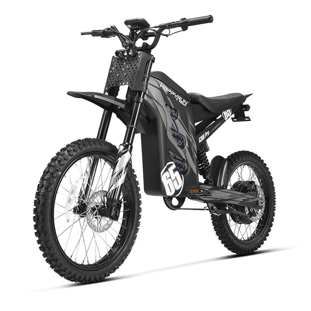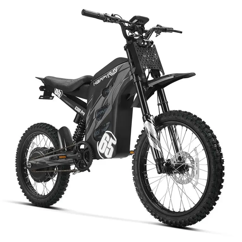 Among electric dirt bikes for adults 50 mph, the fully upgraded 2025 HappyRun G300 Pro, with an aluminum alloy forged frame and a newly developed 6500W (Peak) high-performance motor, is the most affordable fast electric dirt bike! The drive wheel torque is greatly increased, the throttle curve is adjustable, and there are multiple riding modes, so you can enjoy riding in the wild and show the strongest off-road power. Based on the 3rd generation HappyRun power, it is equipped with higher performance off-road brakes, high-quality motorcycle aluminum alloy front forks, independently developed HR suspension system and innovative color digital screen function, which greatly improves the off-road performance of G300 Pro, balances urban commuting, and is suitable for a wider range of people.