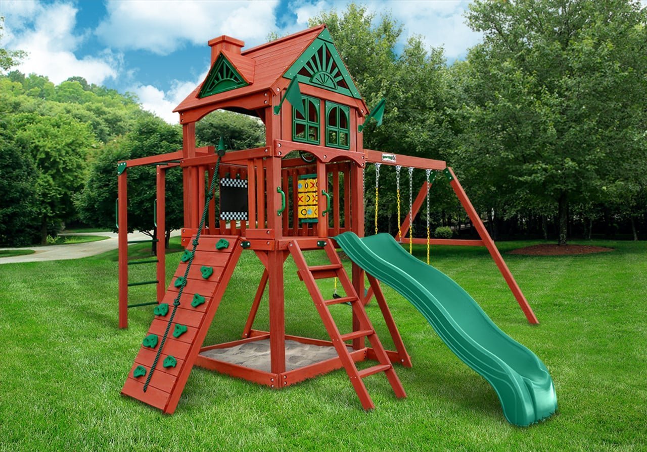 Description An adventure in sliding and climbing is waiting for your kids with the Five Star II Swing Set by Gorilla Playsets. This set includes fun filled features like an Alpine Wave Slideâ„¢, a Trapeze Swing, and TWO Deluxe Swing Belts. It even includes a Chalkboard for writing fun messages. The semi-enclosed clubhouse includes decorative window inserts and is protected with a tongue and groove wood roof. The wait is over, order yours today!