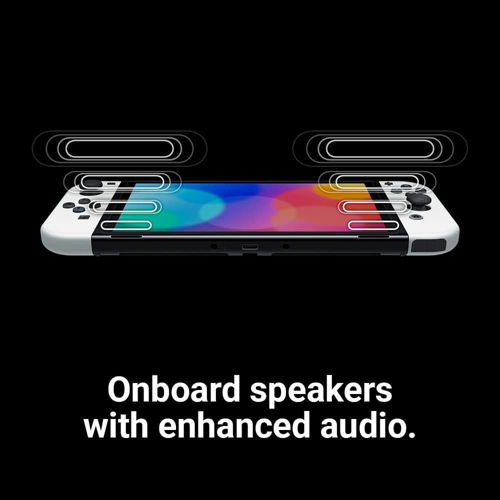 Meet the newest member of the Nintendo Switch family. The new system features a vibrant 7-inch OLED screen, a wide adjustable stand, a dock with a wired LAN port, 64 GB of internal storage, and enhanced audio. Play anytime, anywhere, with anyone. Nintendo Switch can transform to suit your situation, so you can play the games you want, no matter how busy life may be. Pick it up and play with the Joy-Con controllers attached. Nintendo Switch (OLED model) includes an OLED screen with a slimmer bezel. The large screen’s vivid colours and high contrast deliver a rich handheld and tabletop gaming experience, bringing games to life whether you’re racing at top speed or squaring off against enemies. Flip out the stand and hand a controller to another player to share the screen and enjoy competitive or co-operative multiplayer, anytime and anywhere. Nintendo Switch (OLED model)’s wide adjustable stand can be set to your preferred viewing angle for comfortable gameplay in tabletop mode. Gather around a big screen and enjoy gaming with a crowd. Dock your Nintendo Switch to enjoy HD gaming on your TV. The dock included with Nintendo Switch (OLED model) features two USB ports, an HDMI port for connecting to a TV, and a new wired LAN port, allowing for more stable online play when playing in TV mode. Save games to your system with 64 GB of internal storage & enjoy enhanced audio from the system’s onboard speakers. Approximately 4.5 – 9 hours. The battery life will depend on the games you play. For instance, the battery will last approximately 5.5 hours for The Legend of Zelda: Breath of the Wild. 3 hours when charging while the hardware is in sleep mode. Charging time 3 hours and battery life is up to 5.5 hours when fully charged. For ages 3 years and over. EAN: 45496453459.