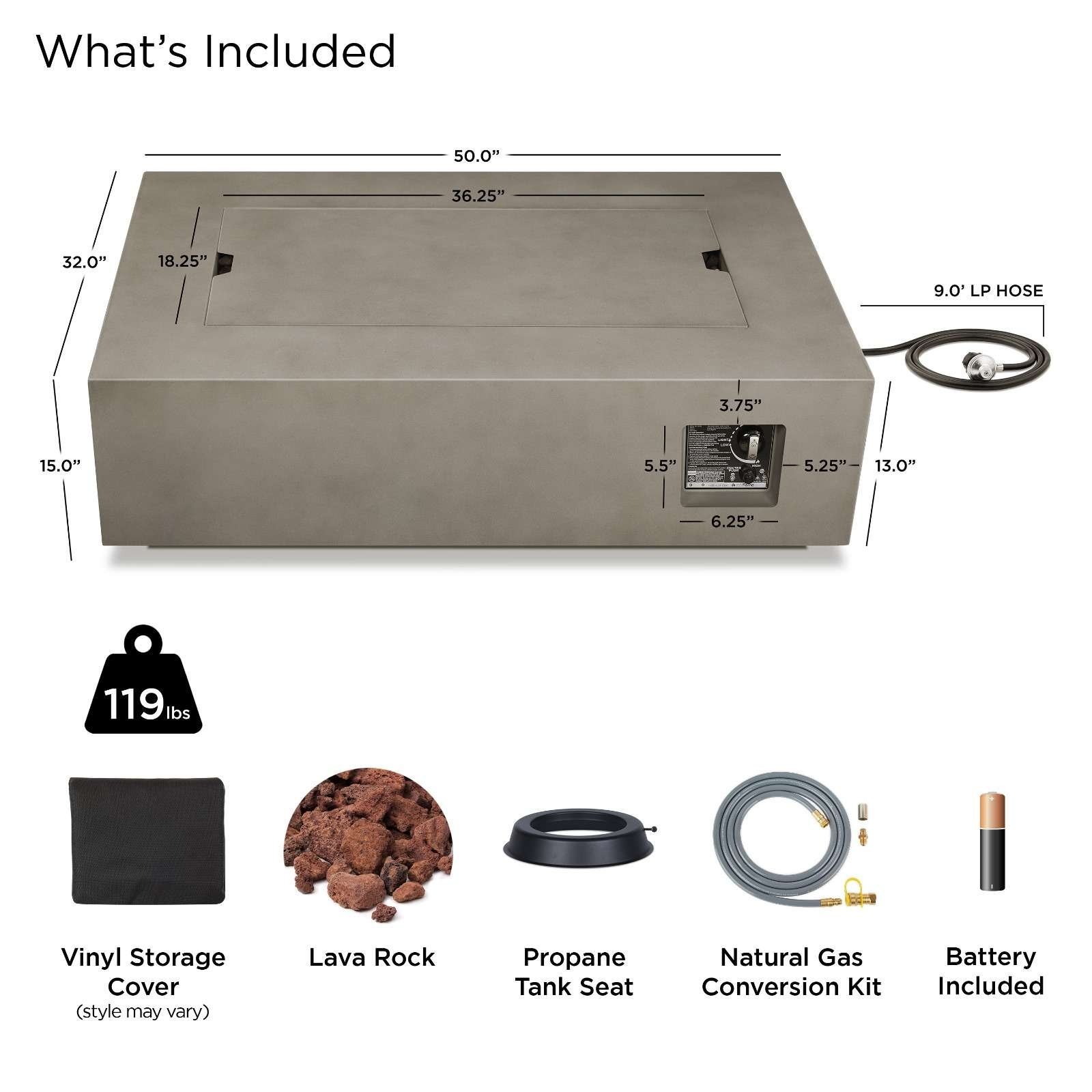 - Fire table: 50″L x 32″W x 15″H; 119 lbs