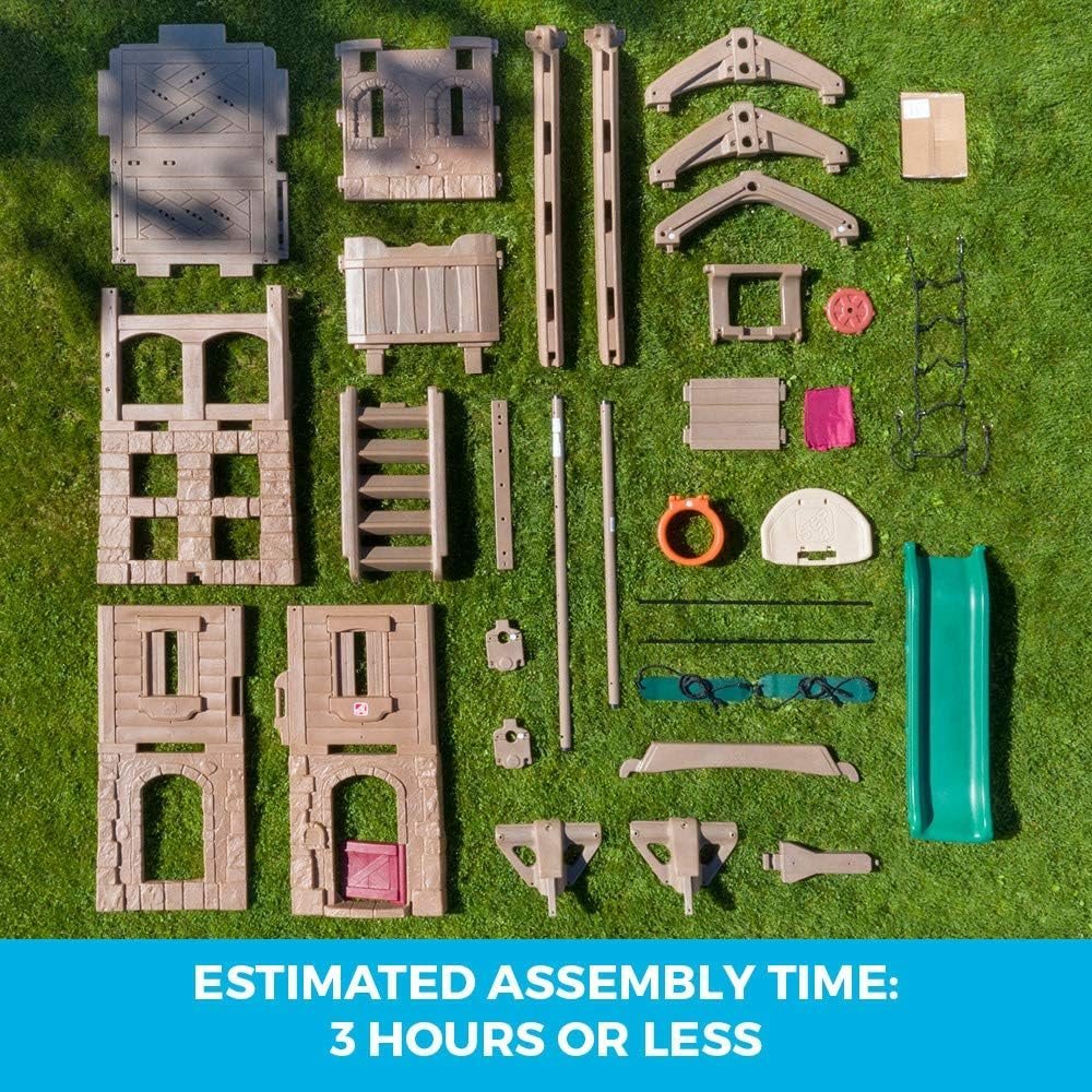 Complete with a two-story clubhouse, this kids’ swing set has so many cool features to keep them entertained – and outside – with active play for hours! The Naturally Playful Adventure Lodge Play Center is a great way to get multiple kids outside socializing and playing together, from the swings and clubhouse hiding spot with working door to the backboard hoop for a quick ball toss game (sorry, ball not included) and more! Kids will enjoy climbing the rope ladder for a bird’s eye view of the backyard, as well as the sturdy steps into the clubhouse to take the slide back down. Their imaginations will run wild with this backyard swing set and clubhouse for kids, where pretend play awaits. Pretend the rustic lodge clubhouse is a pirate ship and use the steering wheel to escape enemy ships; fly through the sky with a make-believe airplane; and even cruise through the desert with a dune buggy – the pretend play possibilities are endless! Plus, this swing set is sturdy and durable; it’s made EverTough™ to last through the most active play for years with double-wall construction that’s fade resistant, never chips or needs to be stained, and is easy to clean. Secure the ground anchors to ensure this outdoor playset stays strong and in place for kids to enjoy for years to come! Made in the USA of US and imported parts.