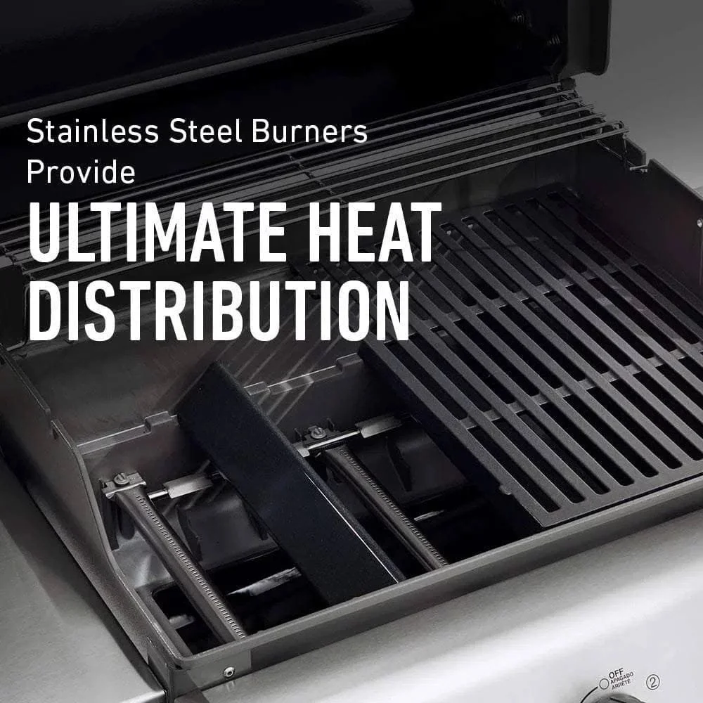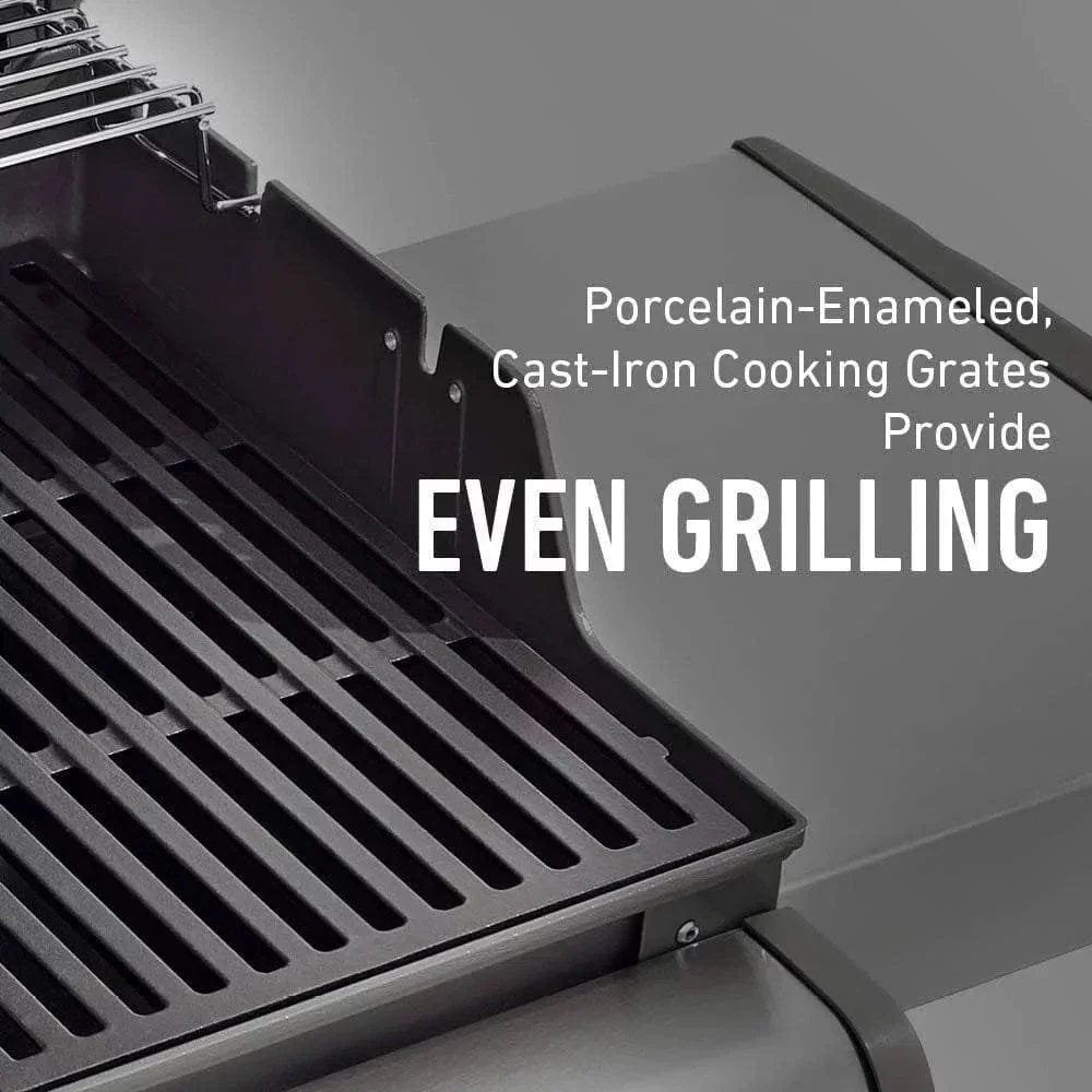 Description Features 3 Stainless steel burners 6 Tool hooks 32,000 BTU-per-hour input main burners Black finish Can be installed as a built-in unit A rotisserie can be added Can be used with bottled gas This grill is equipped with a thermometer, a side shelf, and a removable drip tray. Weights & Dimensions Other Dimensions Overall 5′ 3” H X 4′ 4” W X 2′ 8” D Overall Product Weight 124.7 lb. Primary Cooking Surface Area 529 square inches Warming Rack Surface Area 105 square inches Primary cooking area 424 Square inches Warming rack area 105 Square inches Total cooking area 529 Square inches Specifications Features Ignition Type Electronic ignition Grill Body Primary Material Stainless steel Grate Material Cast Iron Porcelain Coated Grates No Non-Stick No Number of Grates 2 Total Number of Burners 3 Number of Main Burners 3 Main Burner Configuration All conventional Side Burner No Finish Black Maximum Temperature 550°F BTU Output 32000 BTU Burger Count 18 Thermometer Included Yes Wheels Included Yes Locking Wheels Yes Side Shelf or Table Included Yes Compatible Fuel Size 20 lb. Drip Tray Included Yes Removable Drip Tray Yes Regulator Included Yes Tool Hooks Included Yes Weather Resistant Yes Rust Resistant Yes Supplier Intended and Approved Use Residential Use Imported Yes Grill Included Yes Specifications CSA Certified Yes Assembly Assembly Required Yes Suggested Number of People for Assembly/Install 2 Additional Tools Required (Not Included) Screwdriver Mounting / Installation Type Free standing Free Assembly Warranty Commercial Warranty No Product Warranty Yes Warranty Length 10 Years Full or Limited Warranty Limited Part Numbers 47510001 Fuel Type: Natural Gas
