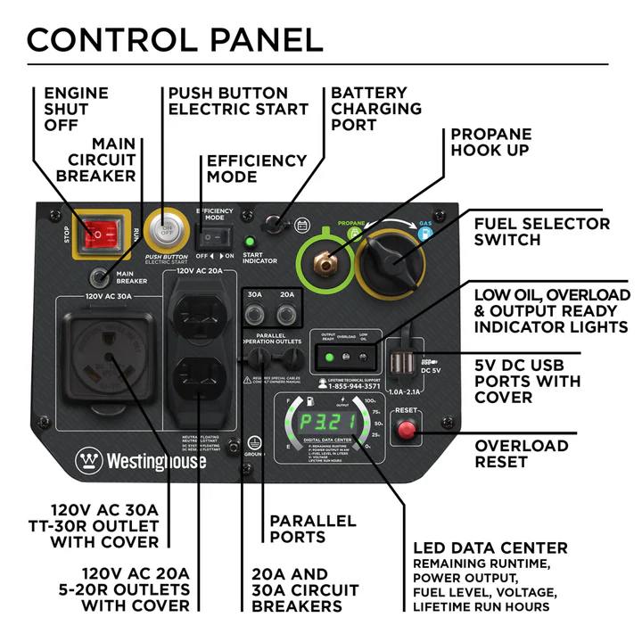 - Real-time LED display with runtime, remaining fuel, load/output, volts and lifetime hours data